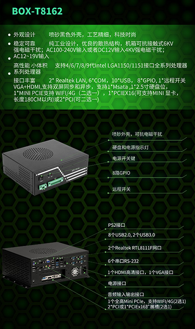 2個(gè)Realtek RTL8111F網(wǎng)口(10/100/1000M自適應(yīng)),6個(gè)串口RS-232 (RS485需加模塊),8個(gè)USB2.0, 2個(gè)USB3.0,方便ODM定制,保證客戶現(xiàn)場復(fù)雜的應(yīng)用需求;HDMI、VGA雙顯示接口,1路音頻輸入輸出;8路數(shù)字開關(guān)量GPIO(4*GPI,4*GPO,可自定義),1個(gè)遠(yuǎn)程開關(guān),1*mSATA,1*SATA 2.5"SSD用于存儲(chǔ);1個(gè)全高M(jìn)ini PCIe,支持WIFI/4G(可二選一),2*PCI或1*PCIEx16擴(kuò)展槽(二選一), 用于集成各種附加卡,例如I/O卡,運(yùn)動(dòng)控制卡、視覺卡和GPU卡(可支持長度180CM的獨(dú)立顯卡)。能滿足不同市場的多樣化需求,可廣泛應(yīng)用于工業(yè)制造、自動(dòng)化檢測、工業(yè)視覺檢測、智能交通等領(lǐng)域。